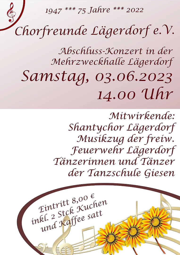Die Chorfreunde Lägerdorf, die ihr 75-jähriges Jubiläum im September 2022 mit den „Kathy-Kelly-Konzerten“ als Auftakt begannen, werden am Samstag, den 03.06.2023, ihr Jubiläumsjahr mit einem örtlichen Konzert in der Mehrzweckhalle an der Liliencronschule in Lägerdorf abschließen. Dabei werden der Shantychor Lägerdorf und der Musikzug der Freiwilligen Feuerwehr Lägerdorf als Akteure mitwirken. Traditionsgemäß haben die drei musikalischen Vereine Lägerdorfs vor der Coronazeit immer ihr „Herbstkonzert“ abgehalten. So freuen sich die Chorfreunde mit ihnen gemeinsam das Jubiläumsjahr zu beschließen.