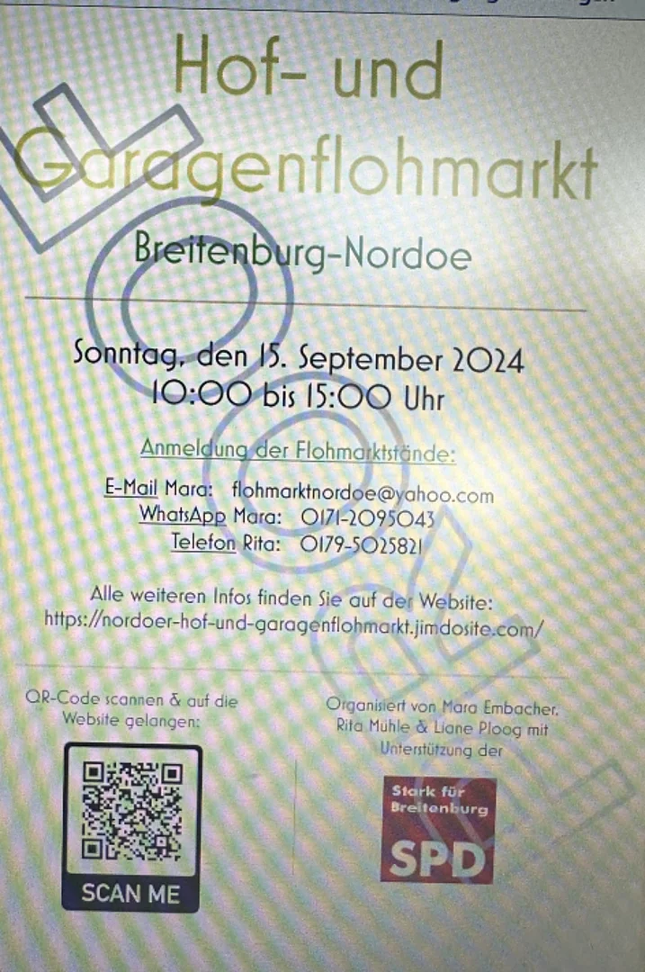 Die SPD Breitenburg lädt zum Hof- und Garagenflohmarkt am Sonntag, d. 15.09.2024 von 10.00 - 15.00 Uhr ein.