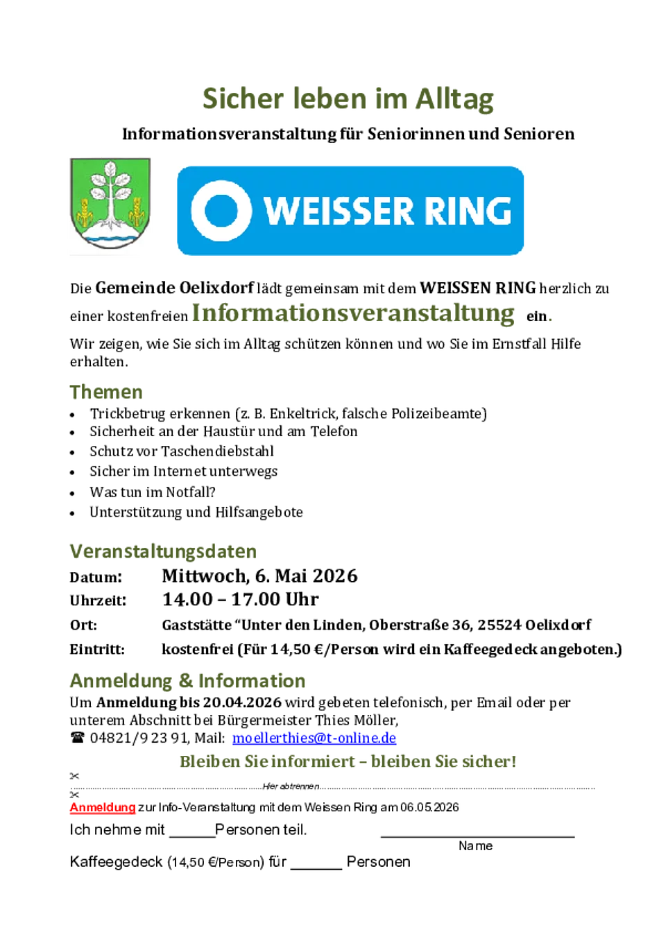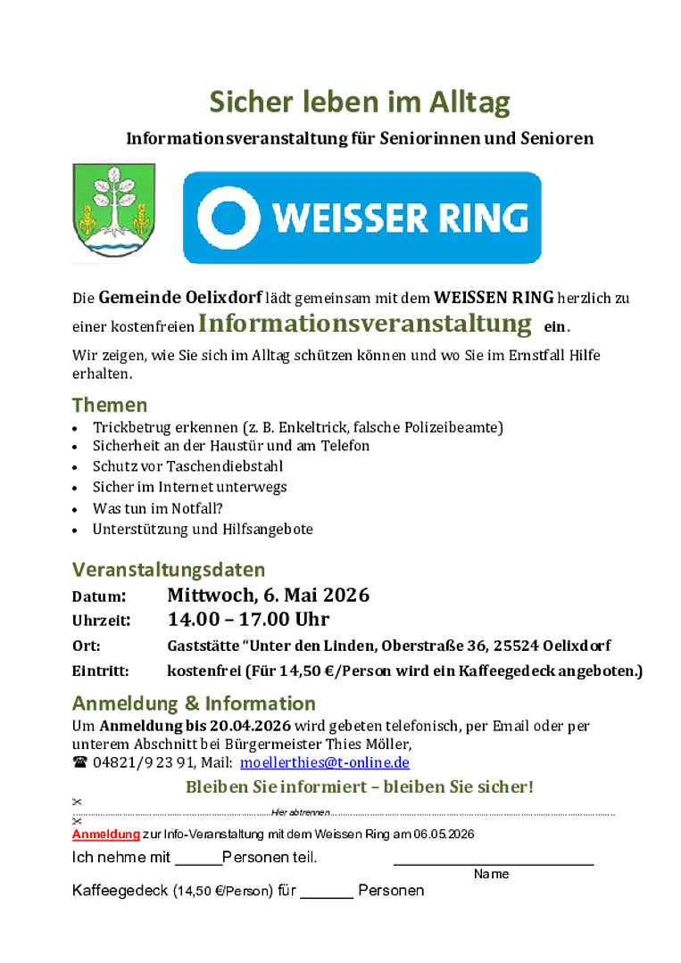 Die Gemeinde Oelixdorf lädt gemeinsam mit dem Weissen Ring zu einem Informationsnachmittag ein.