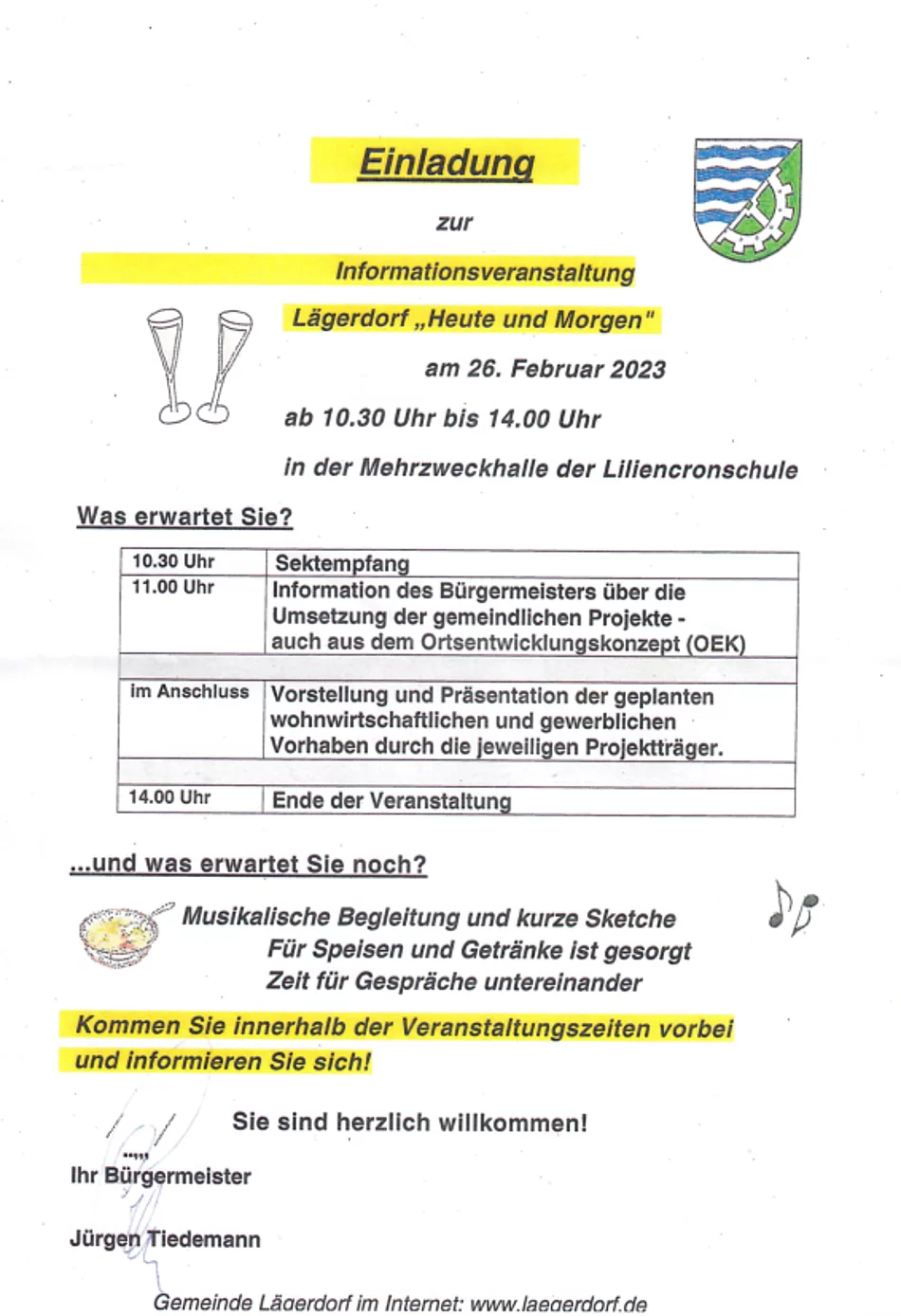Bürgermeister Tiedemann lädt am Sonntag, den 26. Februar 2023 ab 10.30 Uhr bis 14.00 Uhr zu einer Informationsveranstaltung in der Mehrzweckhalle der Liliencronschule ein, in der er über die Umsetzung gemeindlicher Projekte, u.a. aus dem Ortsentwicklungskonzept, berichten möchte (s. Einladung).