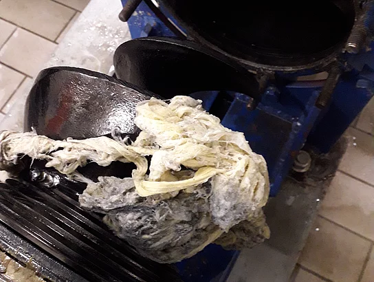 Klärwärter Thomas Hatje ist sauer! Wieder einmal bekam er am Wochenende eine Störungsmeldung auf sein Handy. Sauer war er aber nicht, weil er am Sonntag los musste, sondern weil es immer wieder dieselben Ursachen sind, die die Störungen verursachen. So hatten sich auch diesmal wieder Feuchttücher um die Laufräder der beiden Zulaufpumpen gewickelt. Durch die Rechenstäbe flutscht zwar einiges durch. Bei normalem Toilettenpapier ist das kein Problem: Das besteht aus Zellulose und löst sich in der weiteren Abwasserreinigung so stark auf, dass es für die Pumpen, die das Wasser im Klärwerk weiterleiten, keine große Rolle spielt. Feuchtes Toilettenpapier besteht dagegen nicht aus Papier, sonders aus reißfestem Vlies, also aus Textilfasern.