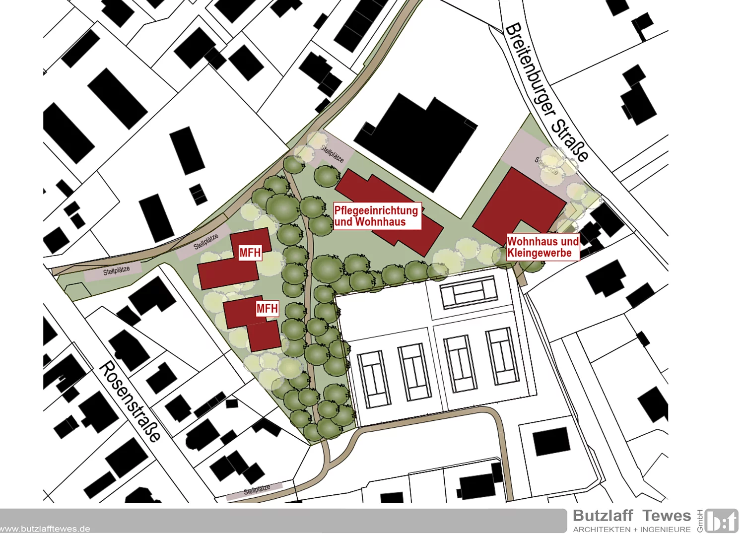 Die Gäste erläuterten jeweils ihre Gründe, das Kampgelände zu überplanen. Herr Butzlaff stellte anhand einer Präsentation das Konzept zur Überplanung und Bebauung des Kampgeländes vor. Angedacht sei die Errichtung einer neuen Pflegeeinrichtung hinter dem bereits bestehenden Netto-Markt, ein Wohn- und Geschäftshaus an der Breitenburger Straße sowie Mehrfamilien- oder Reihenhäuser hinter der Bebauung entlang der Rosenstraße.