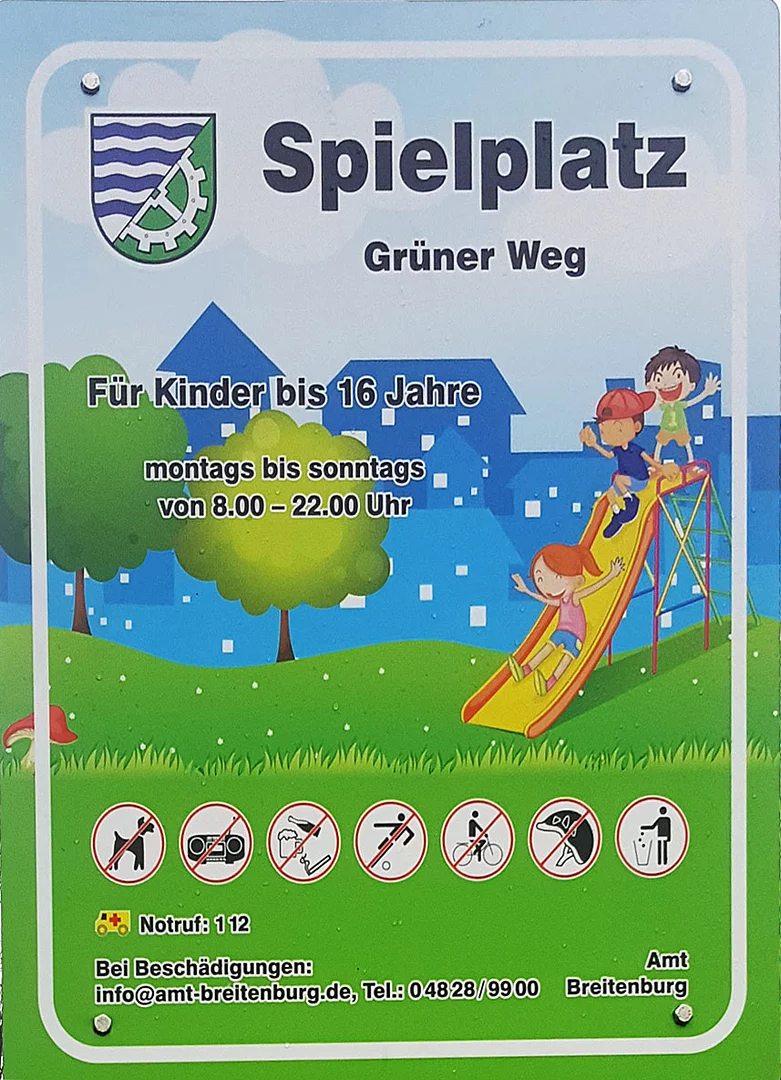 Die Gemeinde Lägerdorf hat ihre in die Jahre gekommenen Spielplatzschilder erneuert. Zusätzlich zu den bisherigen Inhalten ist jetzt auch der Standort des Spielplatzes aufgeführt, um im Notfall die schnelle Erreichbarkeit zu erleichtern. Um Beschädigungen und Mängel einfacher melden zu können, ist die Telefonnummer des Amtes Breitenburg aufgedruckt.