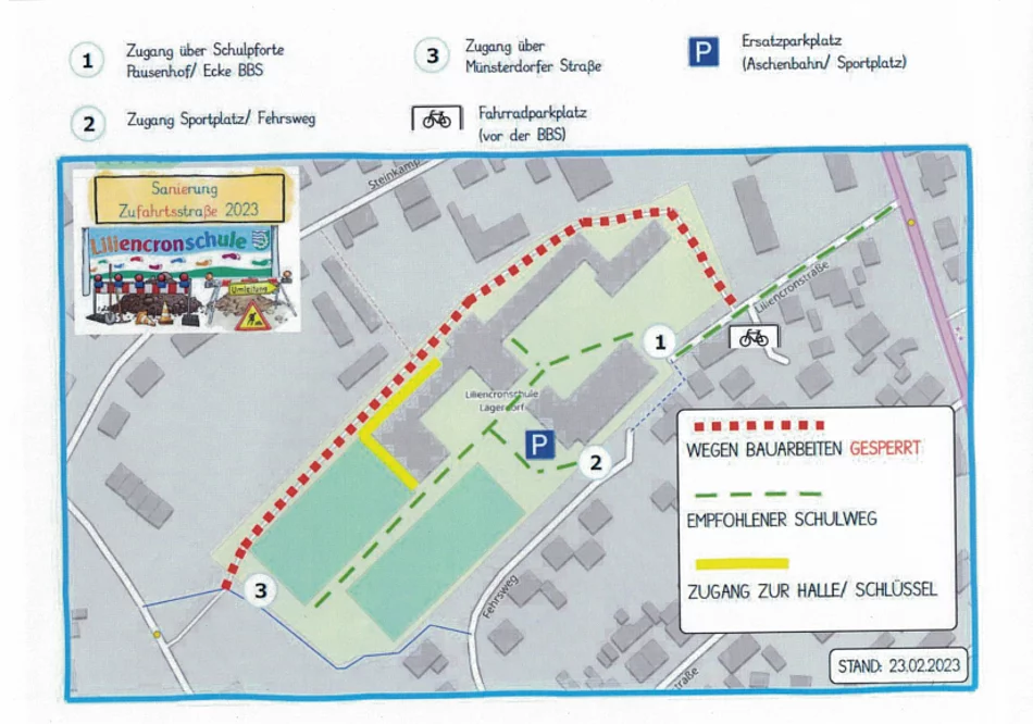 Die Zuwegung zur Liliencronschule ist seit Beginn dieser Woche wegen umfangreicher Straßenbaumaßnahmen gesperrt. Die Schule hat die Eltern wie folgt informiert: