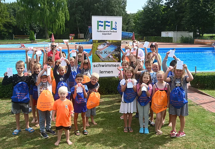 27 glückliche Kinder im Lägerdorfer Freibad sind jetzt berechtigt, das Frühschwimmerabzeichen - Seepferdchen- zu tragen.