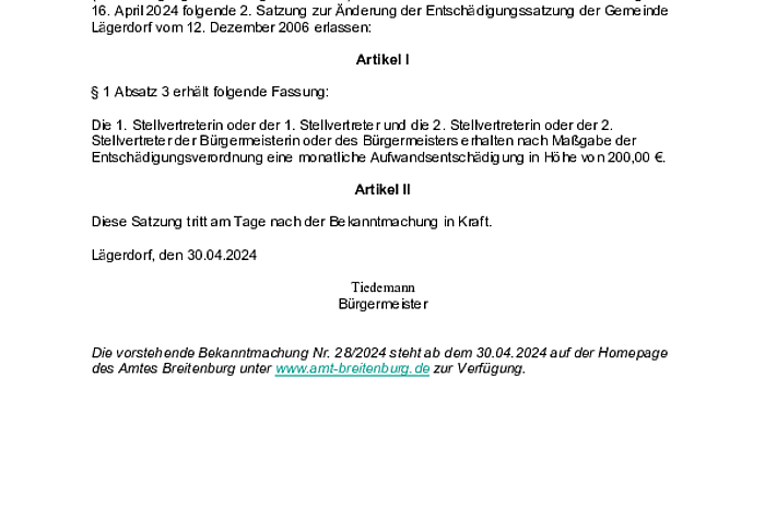 Bekanntmachung Nr. 28/2024 - 2. Satzung zur Änderung der Entschädigungssatzung der Gemeinde Lägerdorf