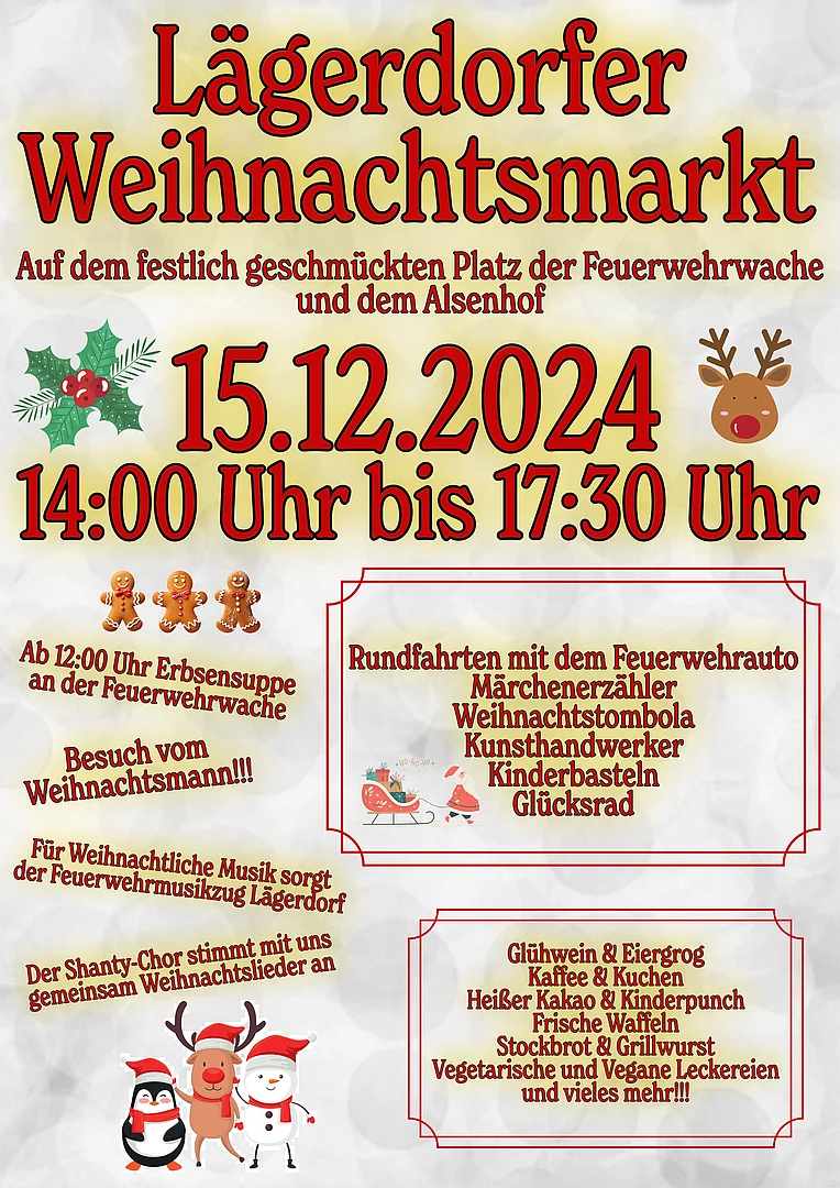 Dieses festliche Ereignis findet am 15.12.2024 ab 14 Uhr statt und hat sich im Laufe der Jahre zu einem unverzichtbaren Höhepunkt entwickelt. Um 17:30 wird er durch das gemeinschaftliche Singen beendet. Auch in diesem Jahr findet dieser wieder auf dem Feuerwehrplatz sowie dem Alsenhof, statt. Ab 12:00 Uhr gibt es an der Feuerwehrwache wieder die geliebte Erbsensuppe!